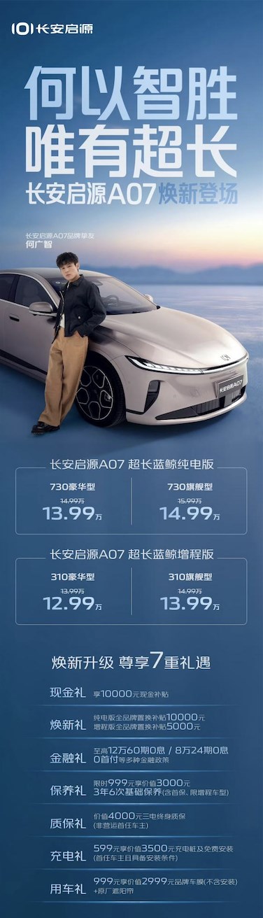 9月10日,長安啟源A07超長藍鯨純電版/增程版煥新登場,共推出4款車型,長安啟源A07超長藍鯨純電版 730豪華型、730旗艦型售價為13.99萬元、14.99萬元;長安啟源A07超長藍鯨增程版310豪華型、310旗艦型售價為12.99萬元、13.99萬元,并提供七重誠意大禮,全面滿足用戶對于越級價值的需求。