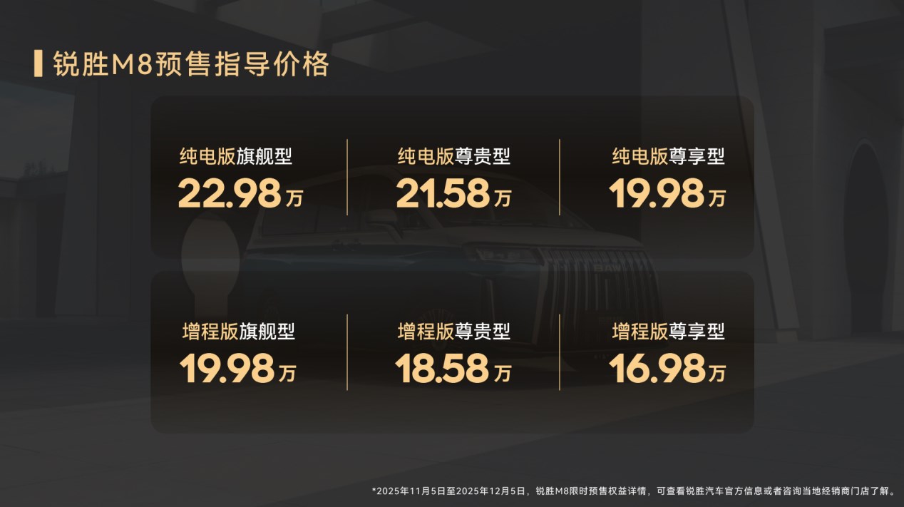 作為北京汽車制造廠孵化的獨(dú)立MPV品牌,銳勝汽車持續(xù)深耕MPV細(xì)分市場(chǎng),敏銳洞察用戶未被滿足的真實(shí)需求與市場(chǎng)空白。銳勝M(fèi)8的推出,為用戶提供了更全面的選擇,進(jìn)一步提升了出行的品質(zhì)與體驗(yàn)。目前,銳勝M(fèi)8預(yù)售已經(jīng)開啟,能否獲得市場(chǎng)青睞,我們拭目以待!